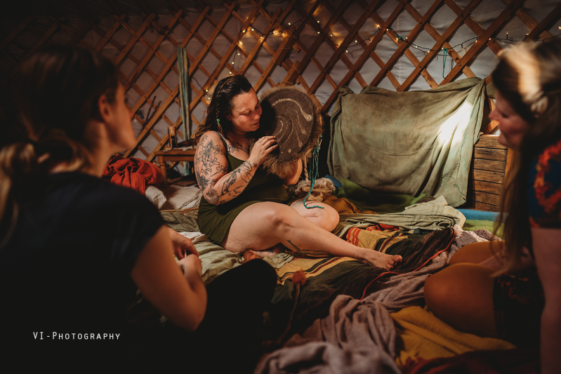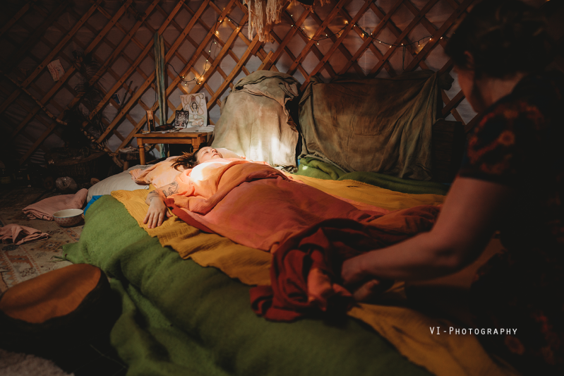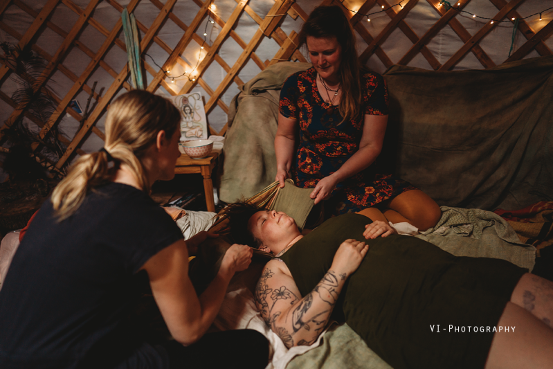 Vos, de baby van Nienke was bij ons in de yurt, hij was wat onrustig en had enorm veel behoefte om te knuffelen en te drinken. Na de steam zou Nienke gemasseerd worden en brachten we Vos even naar zijn papa. Zo kon Nienke echt ontspannen. De massage werd door Mandy en Justina (beide doula’s ) tegelijk gedaan. Met warme olie werd Nienke haar lijf van boven tot onder liefdevol gemasseerd.